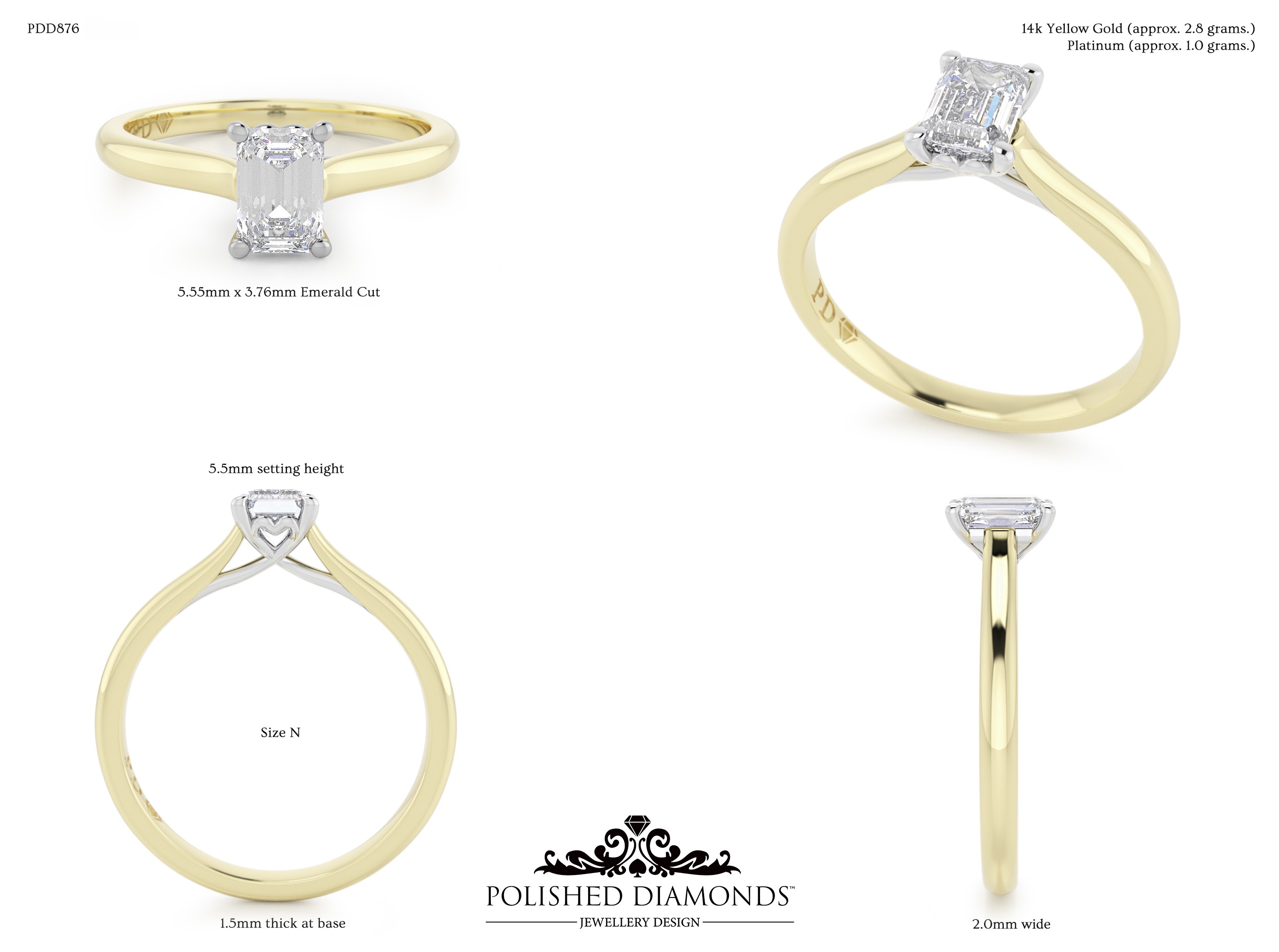 The Emerald Solitaire Diamond Ring (PDD876) is a handcrafted engagement ring featuring a brilliant emerald-cut diamond in a classic solitaire setting, crafted in New Zealand. Available in platinum, white gold, yellow gold, or rose gold, this ring is made to order and fully customisable in diamond size, carat weight, and setting style. Visit our Auckland, Wellington, or Christchurch studios or enquire online for personalised pricing.