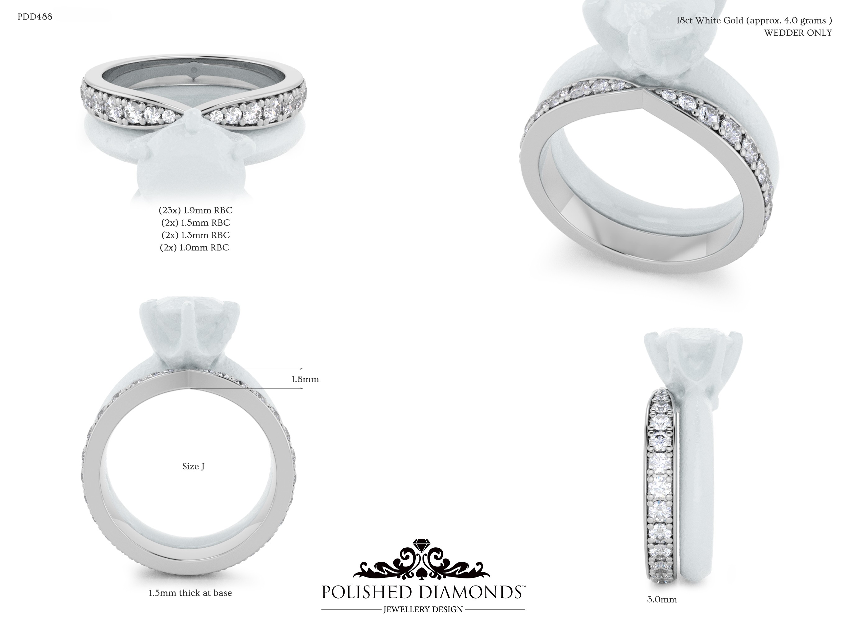 The Wedding Ring (PDD487) is a finely crafted band made to order in our New Zealand workshop. Available in platinum, white gold, yellow gold, and rose gold, each wedding band is individually sized and fully customisable in width, profile, and finish to complement your engagement ring perfectly. Visit our Auckland, Wellington, or Christchurch studios or contact our team to discuss design options.