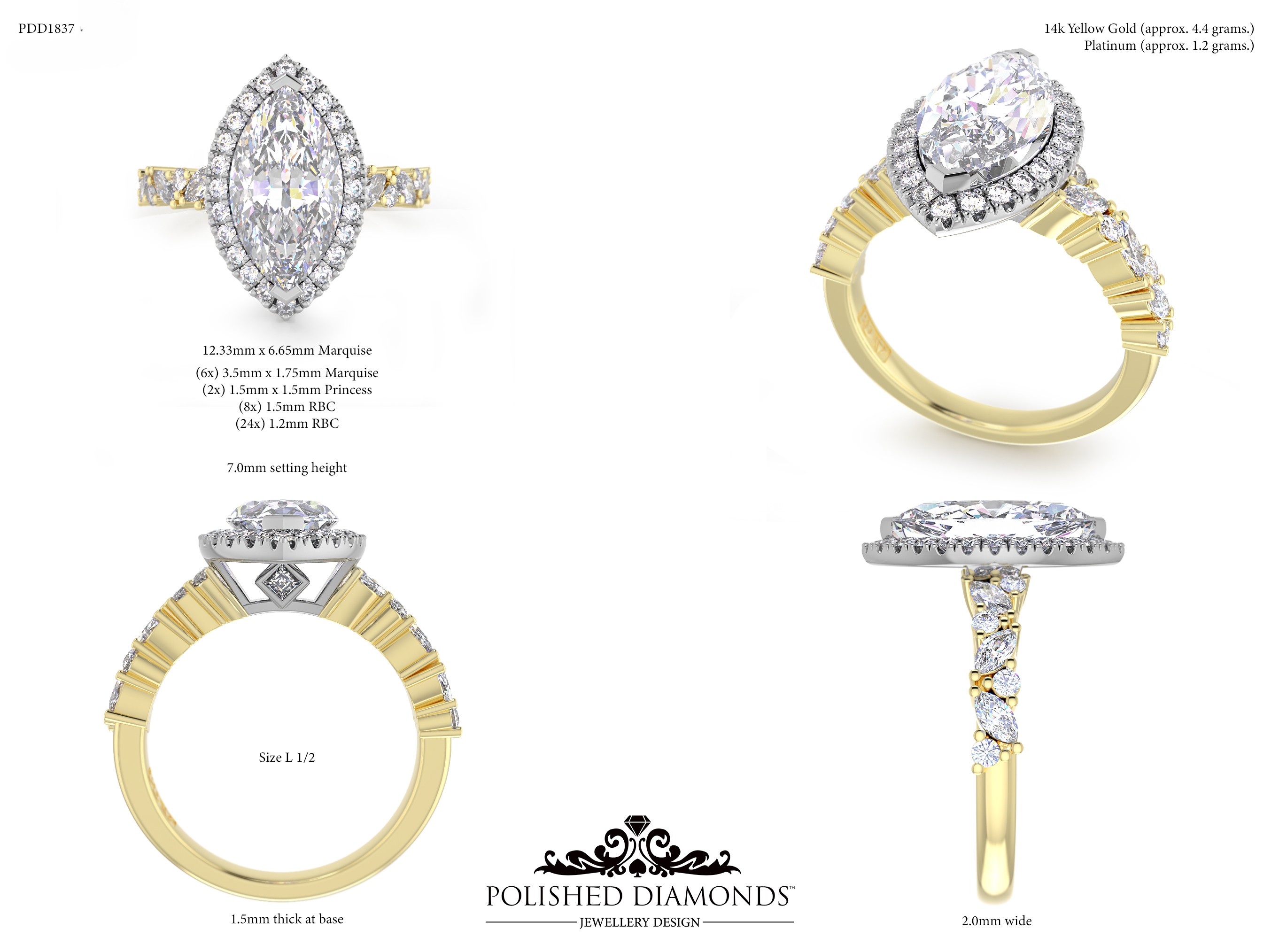 The Marquise Halo Diamond Ring (PDD1837) features a stunning marquise-cut centre diamond surrounded by a brilliant halo of smaller diamonds for exceptional sparkle. Handcrafted in New Zealand and made to order in platinum, white gold, yellow gold, or rose gold. Every detail is fully customisable — visit our Auckland, Wellington, or Christchurch studios or enquire online for pricing and options.