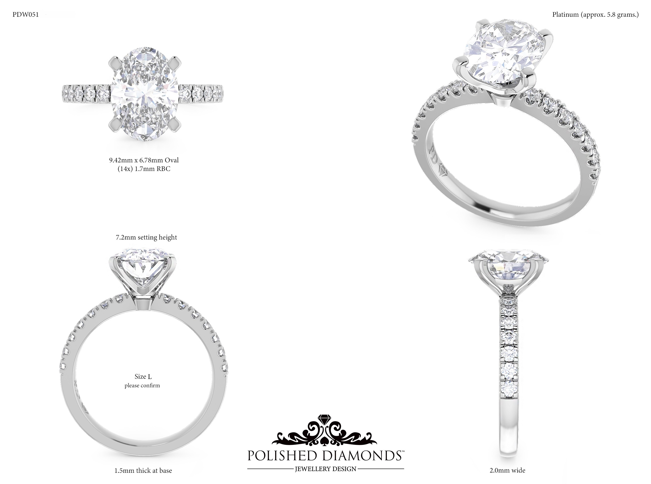 The Oval Solitaire Diamond Ring (PDW051) is a handcrafted engagement ring featuring a brilliant oval-cut diamond in a classic solitaire setting, crafted in New Zealand. Available in platinum, white gold, yellow gold, or rose gold, this ring is made to order and fully customisable in diamond size, carat weight, and setting style. Visit our Auckland, Wellington, or Christchurch studios or enquire online for personalised pricing.