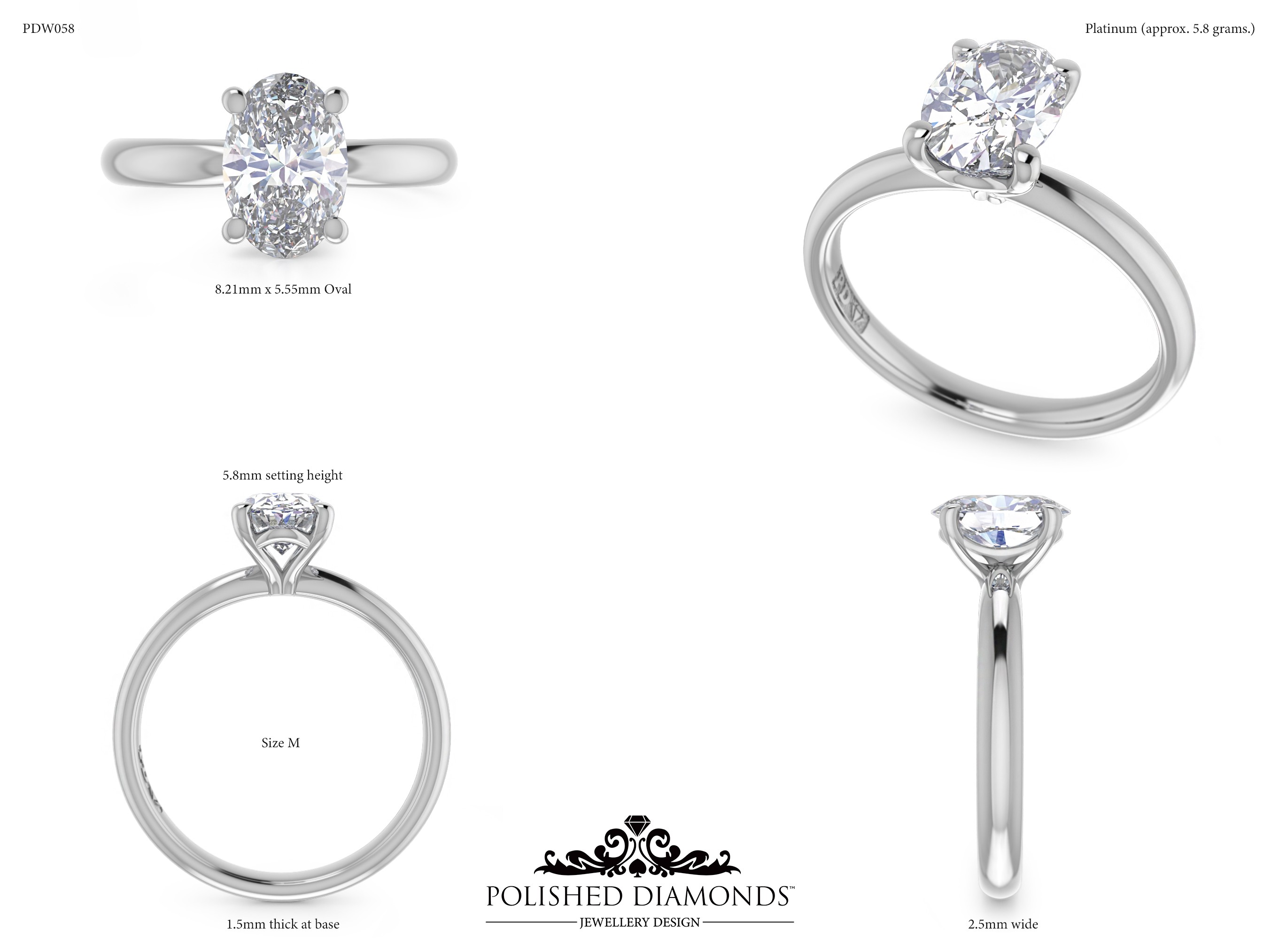 The Oval Solitaire Diamond Ring (PDW058) is a handcrafted engagement ring featuring a brilliant oval-cut diamond in a classic solitaire setting, crafted in New Zealand. Available in platinum, white gold, yellow gold, or rose gold, this ring is made to order and fully customisable in diamond size, carat weight, and setting style. Visit our Auckland, Wellington, or Christchurch studios or enquire online for personalised pricing.