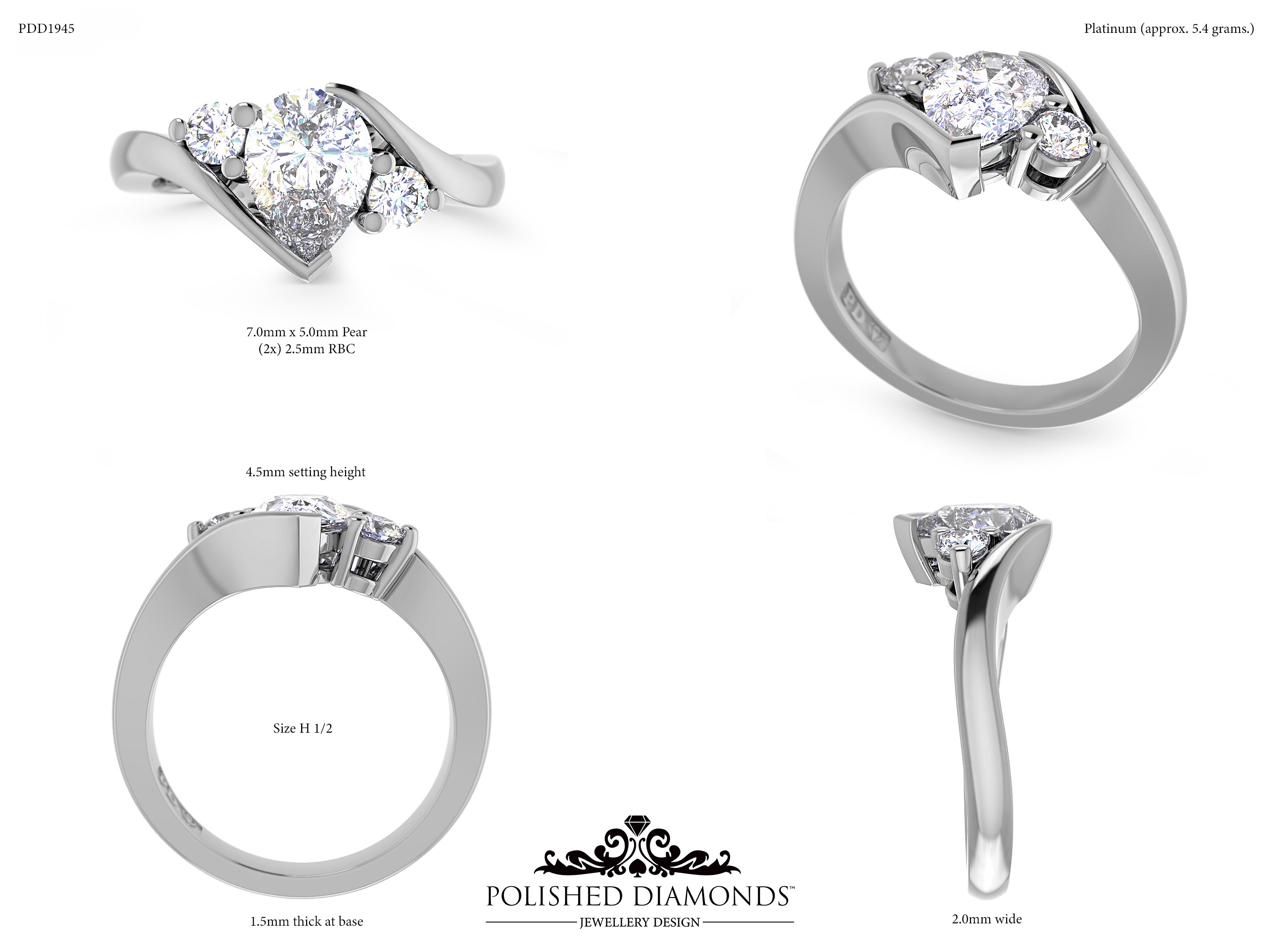 The Pear Trilogy Diamond Ring (PDD1945) features three brilliant pear-cut diamonds representing your past, present, and future — a deeply meaningful choice for engagements and anniversaries. Crafted in New Zealand and made to order in your choice of platinum, white gold, yellow gold, or rose gold. Visit our Auckland, Wellington, or Christchurch studios or enquire online for pricing.