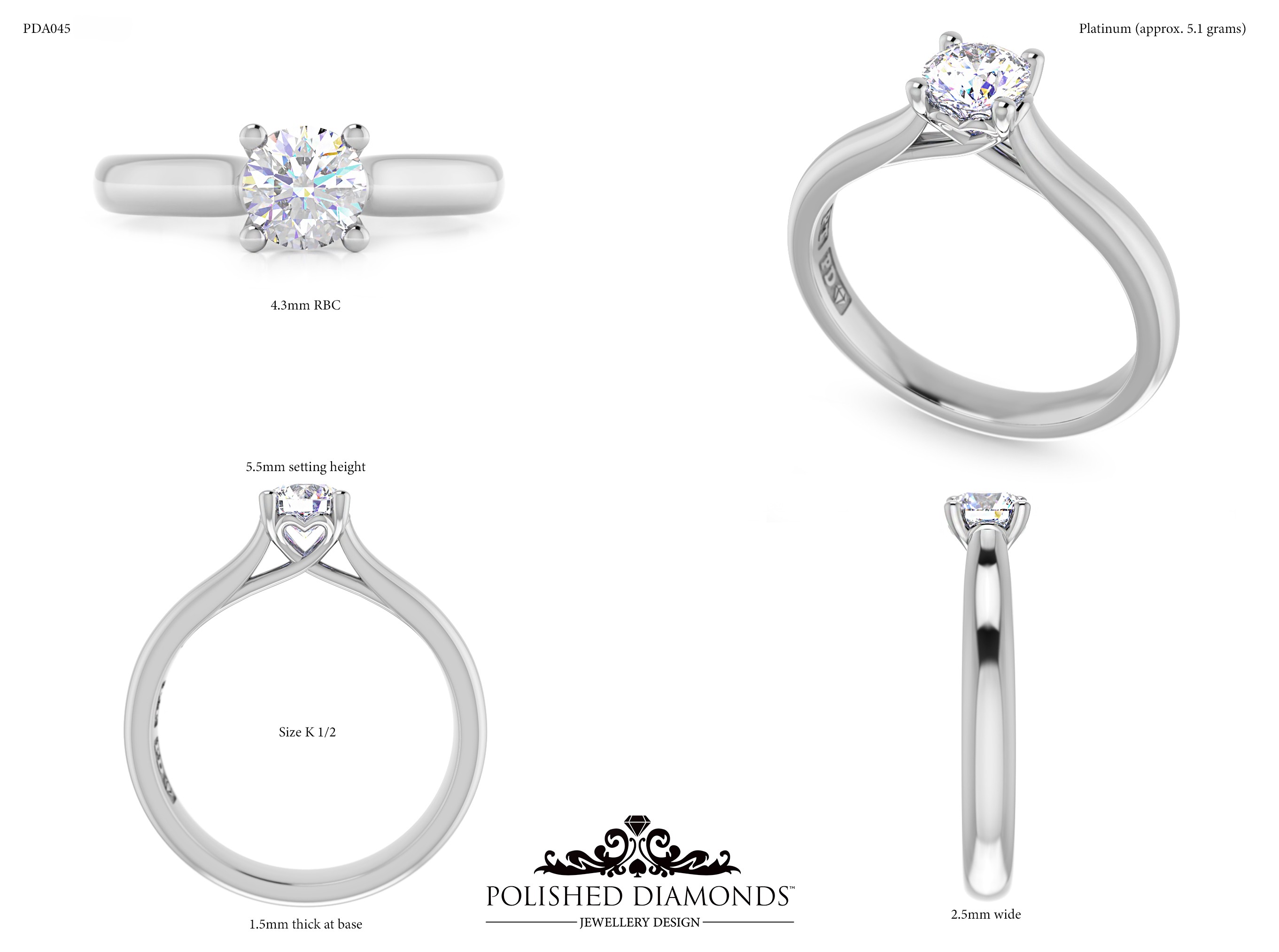 A handcrafted round solitaire ring. Product ID PDA045. Elegant, timeless, and made with expert craftsmanship.