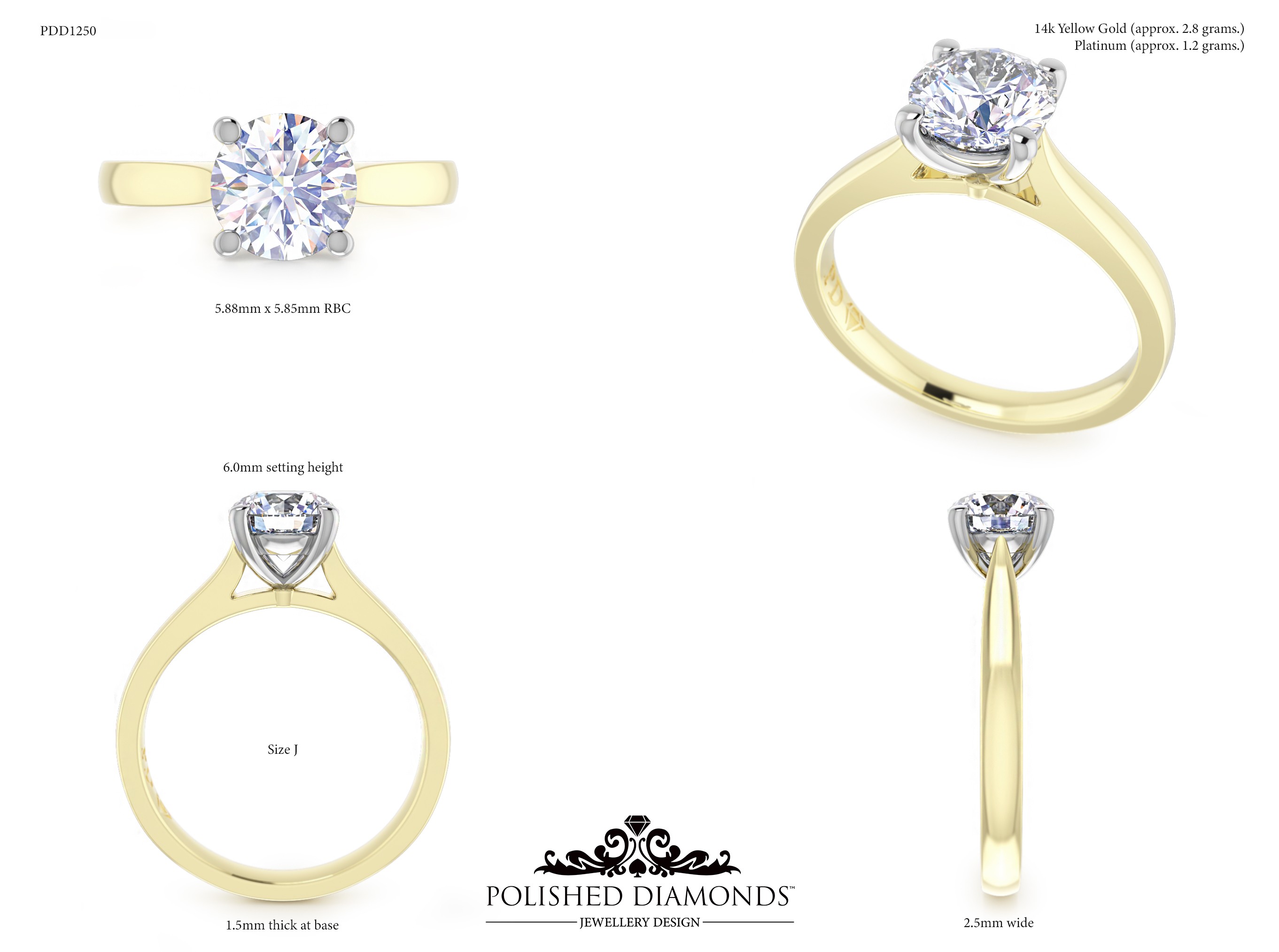 The Round Solitaire Diamond Ring (PDD1250) is a handcrafted engagement ring featuring a brilliant round-cut diamond in a classic solitaire setting, crafted in New Zealand. Available in platinum, white gold, yellow gold, or rose gold, this ring is made to order and fully customisable in diamond size, carat weight, and setting style. Visit our Auckland, Wellington, or Christchurch studios or enquire online for personalised pricing.
