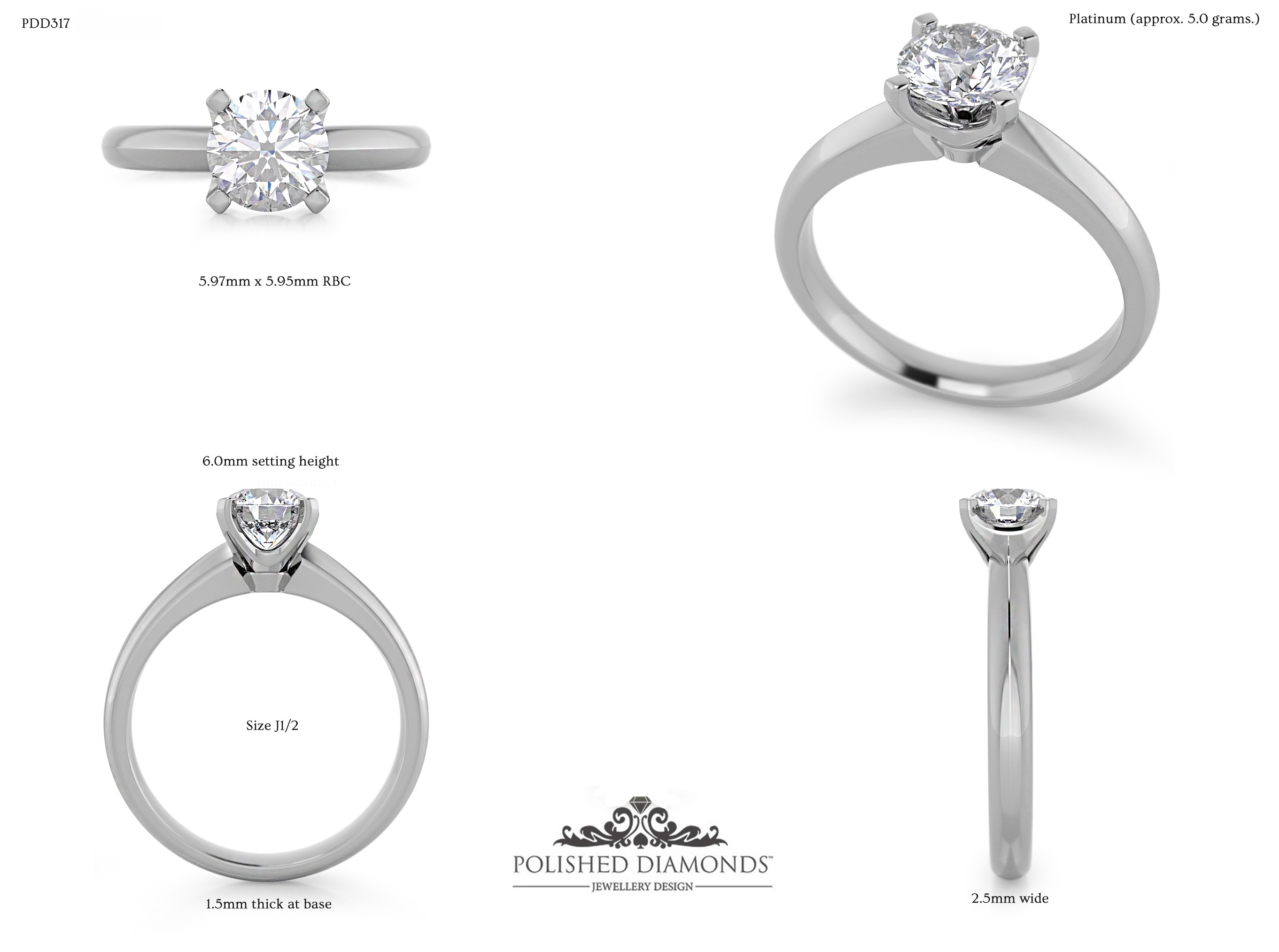 The Round Solitaire Diamond Ring (PDD317) is a handcrafted engagement ring featuring a brilliant round-cut diamond in a classic solitaire setting, crafted in New Zealand. Available in platinum, white gold, yellow gold, or rose gold, this ring is made to order and fully customisable in diamond size, carat weight, and setting style. Visit our Auckland, Wellington, or Christchurch studios or enquire online for personalised pricing.