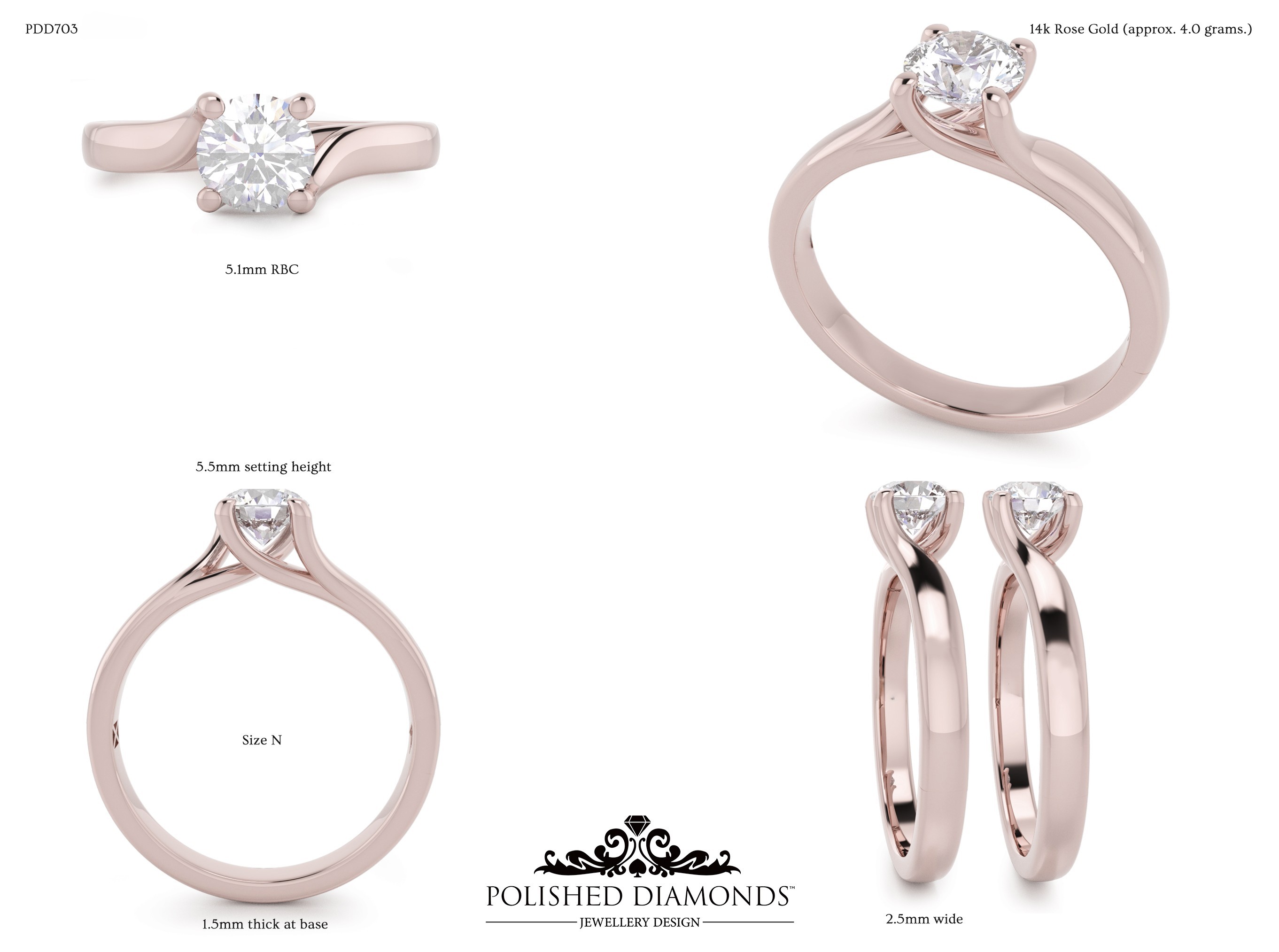 The Round Solitaire Diamond Ring (PDD703) is a handcrafted engagement ring featuring a brilliant round-cut diamond in a classic solitaire setting, crafted in New Zealand. Available in platinum, white gold, yellow gold, or rose gold, this ring is made to order and fully customisable in diamond size, carat weight, and setting style. Visit our Auckland, Wellington, or Christchurch studios or enquire online for personalised pricing.