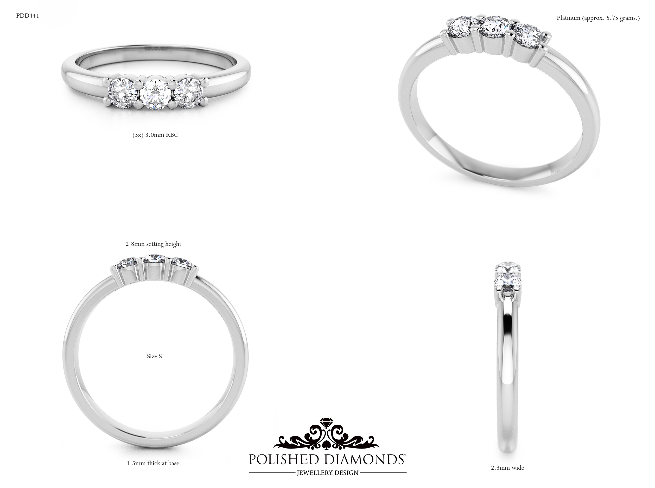 The Round Trilogy Diamond Ring (PDD441) features three brilliant round-cut diamonds representing your past, present, and future — a deeply meaningful choice for engagements and anniversaries. Crafted in New Zealand and made to order in your choice of platinum, white gold, yellow gold, or rose gold. Visit our Auckland, Wellington, or Christchurch studios or enquire online for pricing.