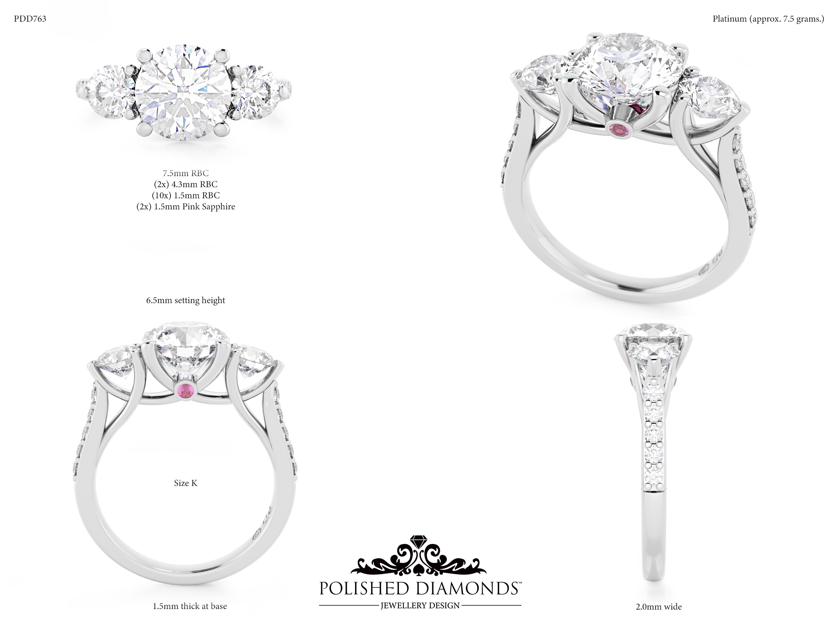 The Round Trilogy Diamond Ring (PDD763) features three brilliant round-cut diamonds representing your past, present, and future — a deeply meaningful choice for engagements and anniversaries. Crafted in New Zealand and made to order in your choice of platinum, white gold, yellow gold, or rose gold. Visit our Auckland, Wellington, or Christchurch studios or enquire online for pricing.