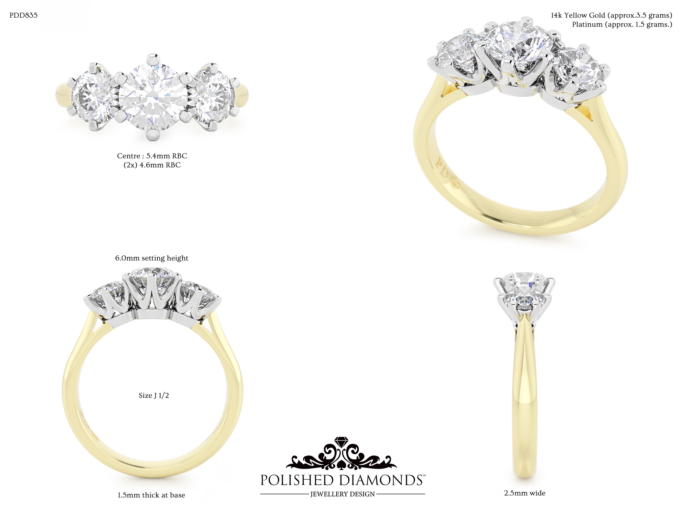 The Round Trilogy Diamond Ring (PDD835) features three brilliant round-cut diamonds representing your past, present, and future — a deeply meaningful choice for engagements and anniversaries. Crafted in New Zealand and made to order in your choice of platinum, white gold, yellow gold, or rose gold. Visit our Auckland, Wellington, or Christchurch studios or enquire online for pricing.