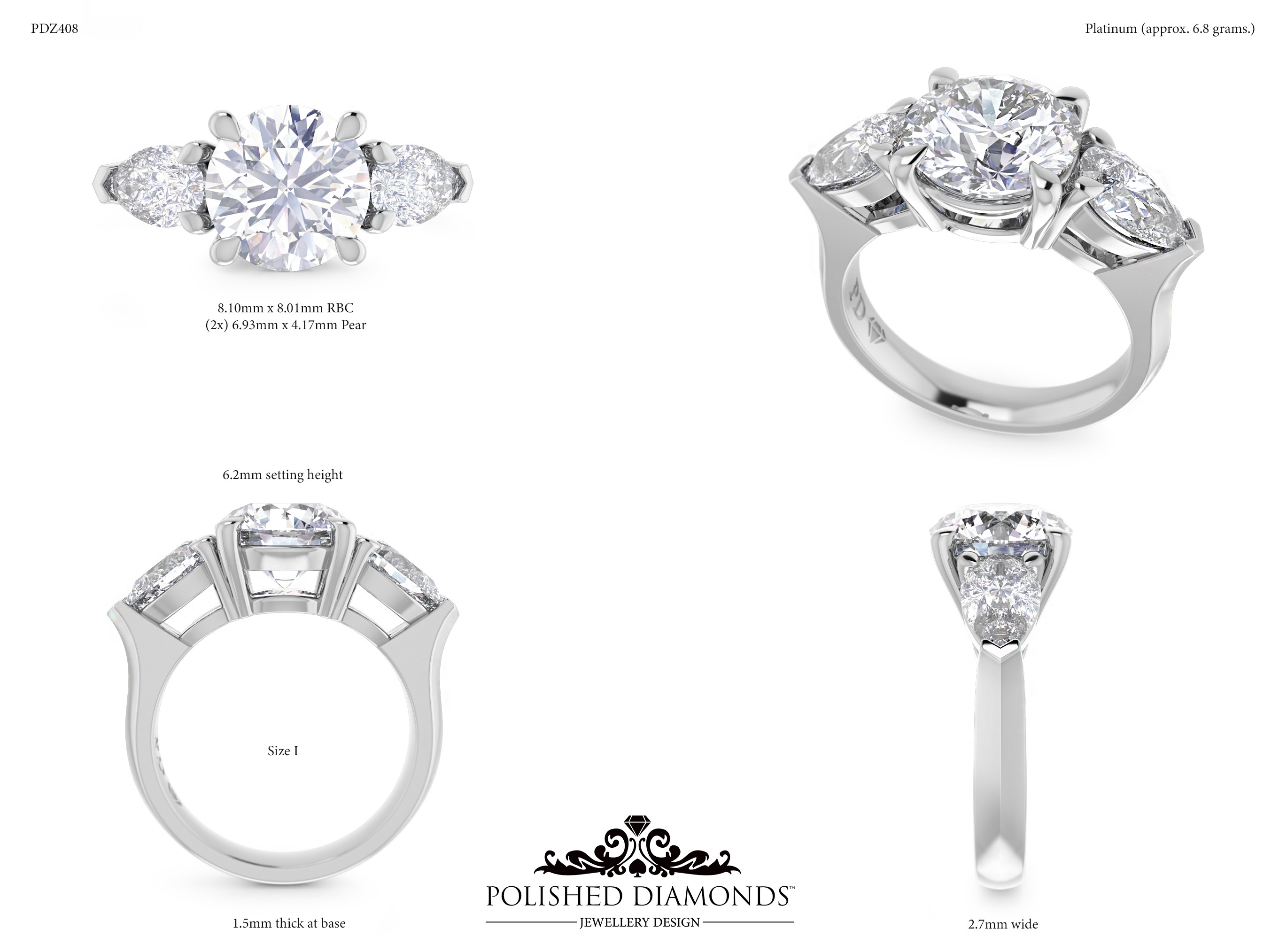 The Round Trilogy Diamond Ring (PDZ408) features three brilliant round-cut diamonds representing your past, present, and future — a deeply meaningful choice for engagements and anniversaries. Crafted in New Zealand and made to order in your choice of platinum, white gold, yellow gold, or rose gold. Visit our Auckland, Wellington, or Christchurch studios or enquire online for pricing.
